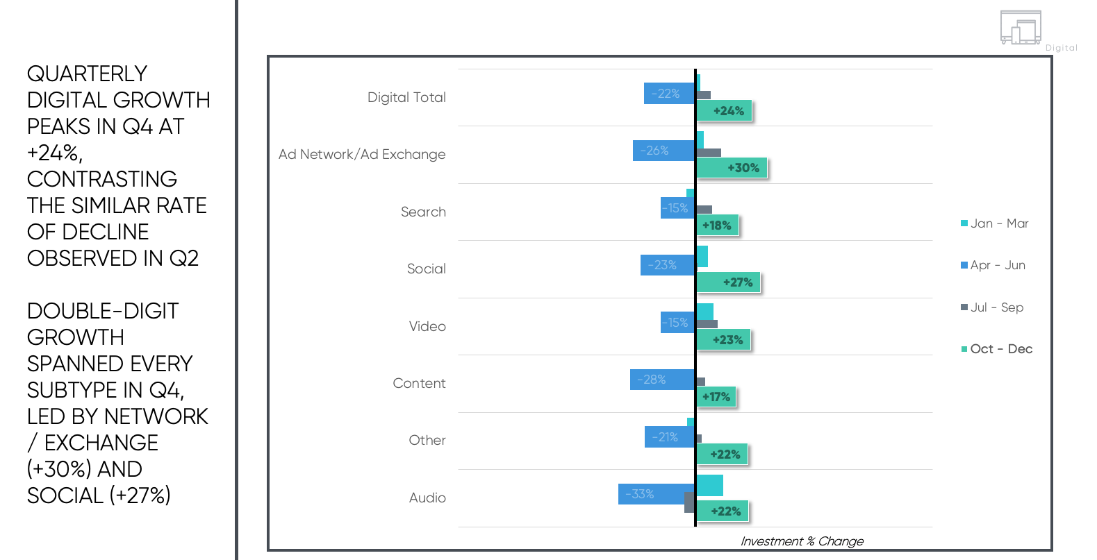 While the initial shock of the pandemic triggered a devastating 32% decline in second quarter ad spend, since then the market has been steadily recovering. We saw the bottom of global advertising demand in Q2, after that the markets adjusted to a new `Covid normal’ the level of demand has begun to return with the total down just -6% for Q3 and then returning to strong growth of +5% in Q4.
