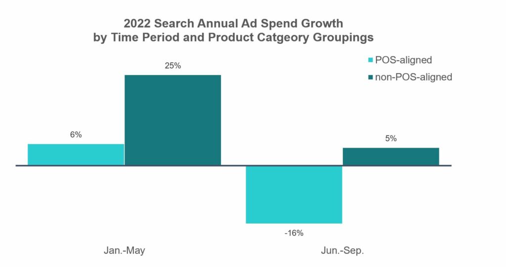 Search growth slowed for both product category groupings across the two time periods. For POS-aligned categories, as an aggregated whole, yearly advertising spend turned negative during the summer months. In both time periods, the spread of the growth rates remained steady, with the POS-aligned product category group trailing by roughly 20 percentage points.